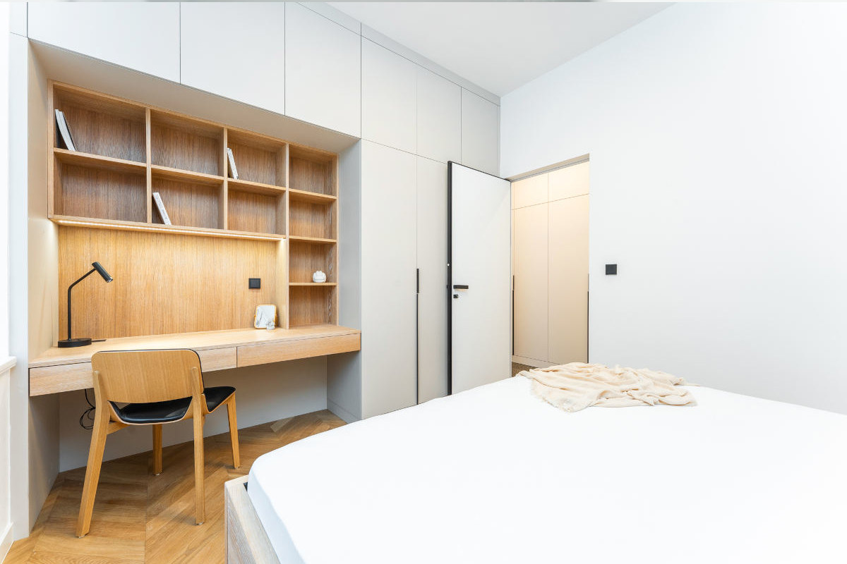 Ložnice disponují zakázkovým nábytkem – manželské postele s kvalitními matracemi, vestavěné skříně a pracovní kouty.